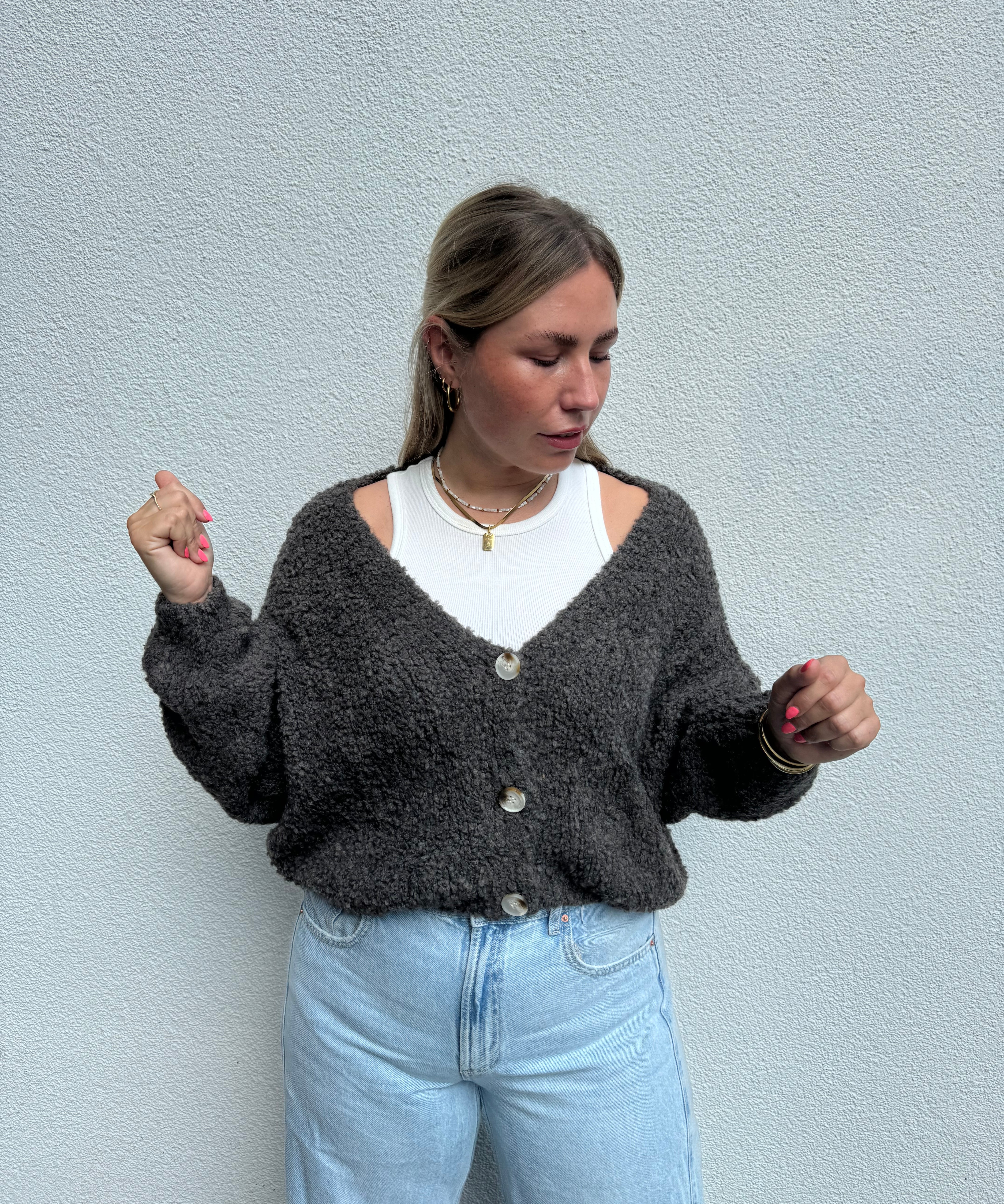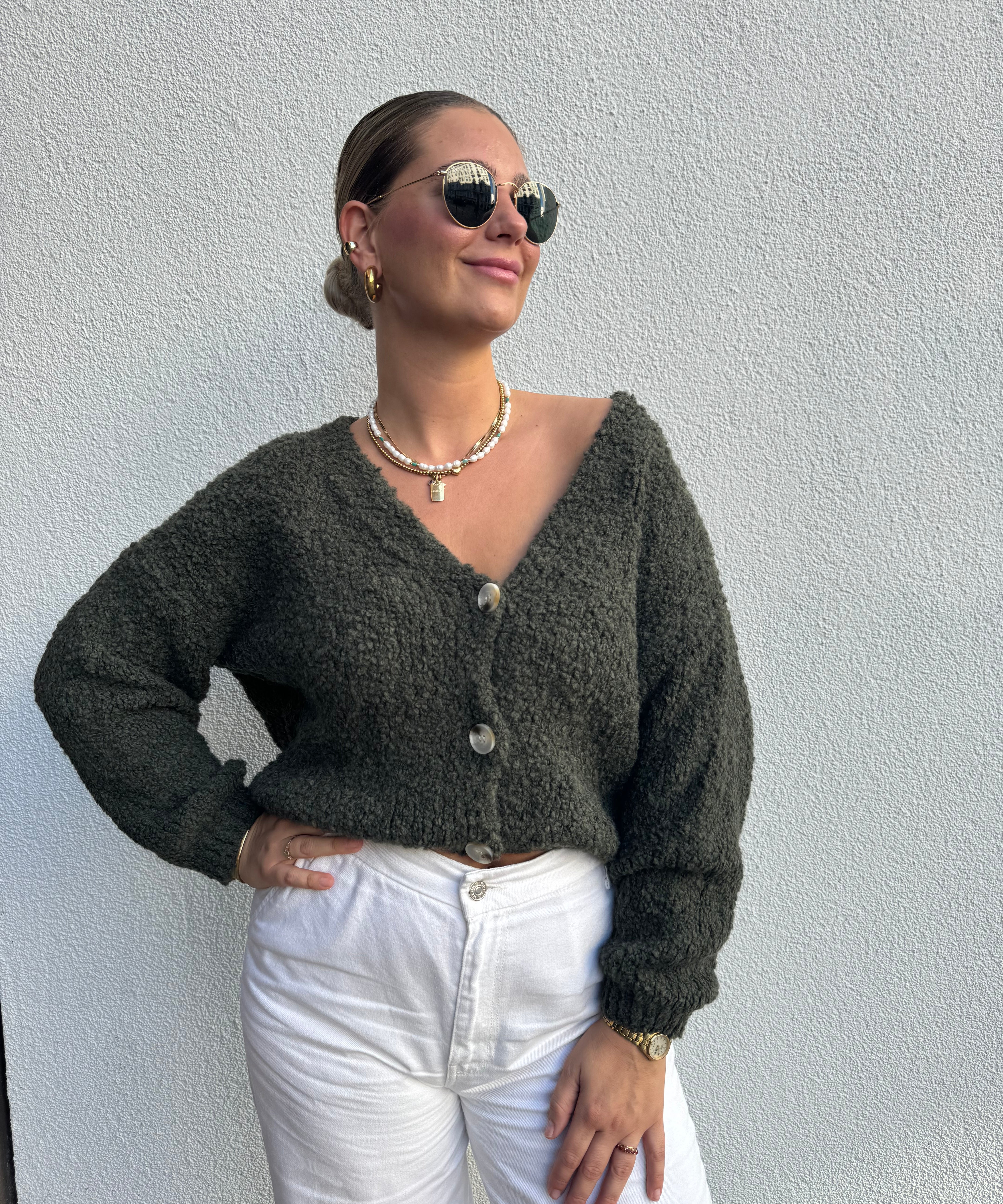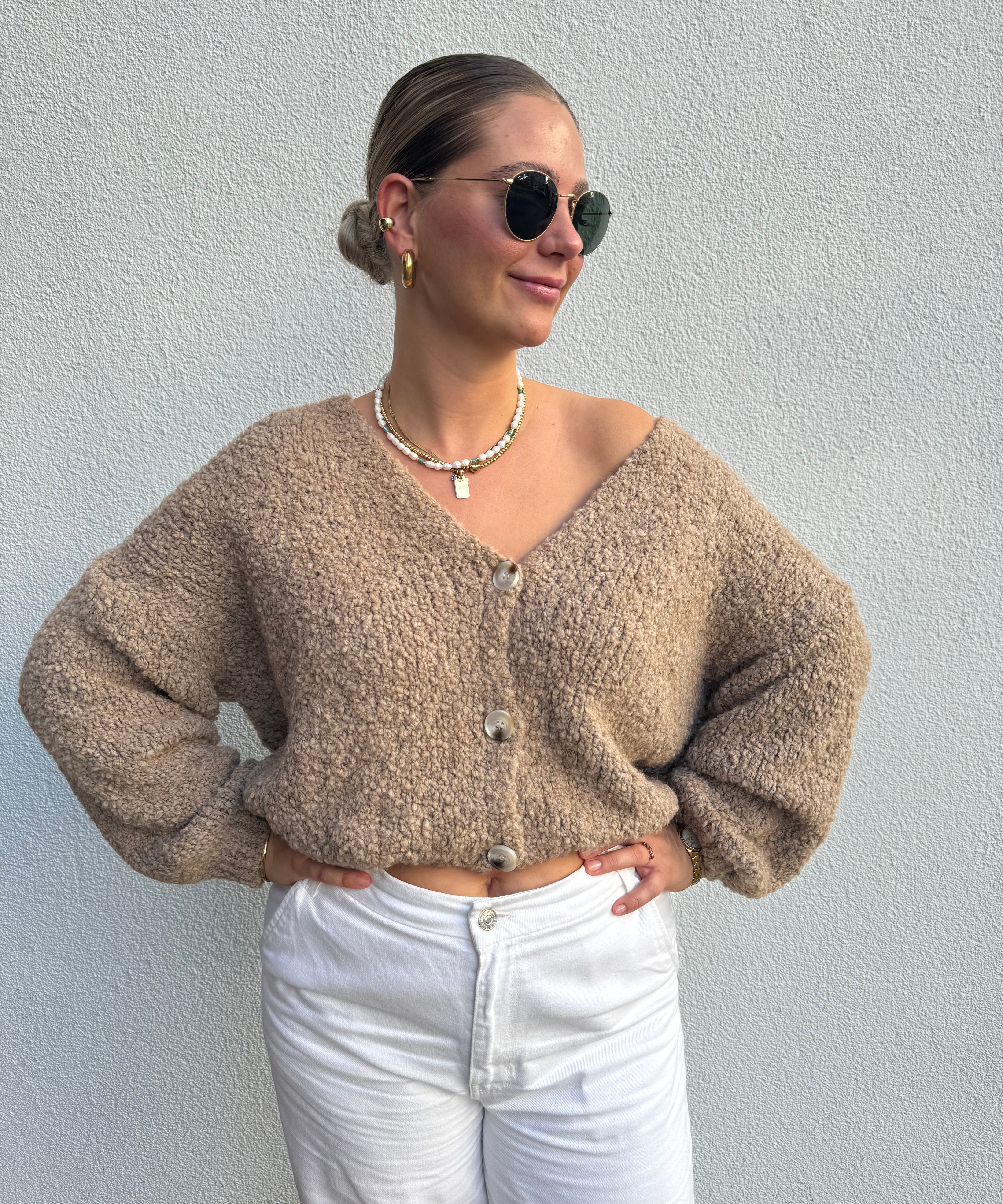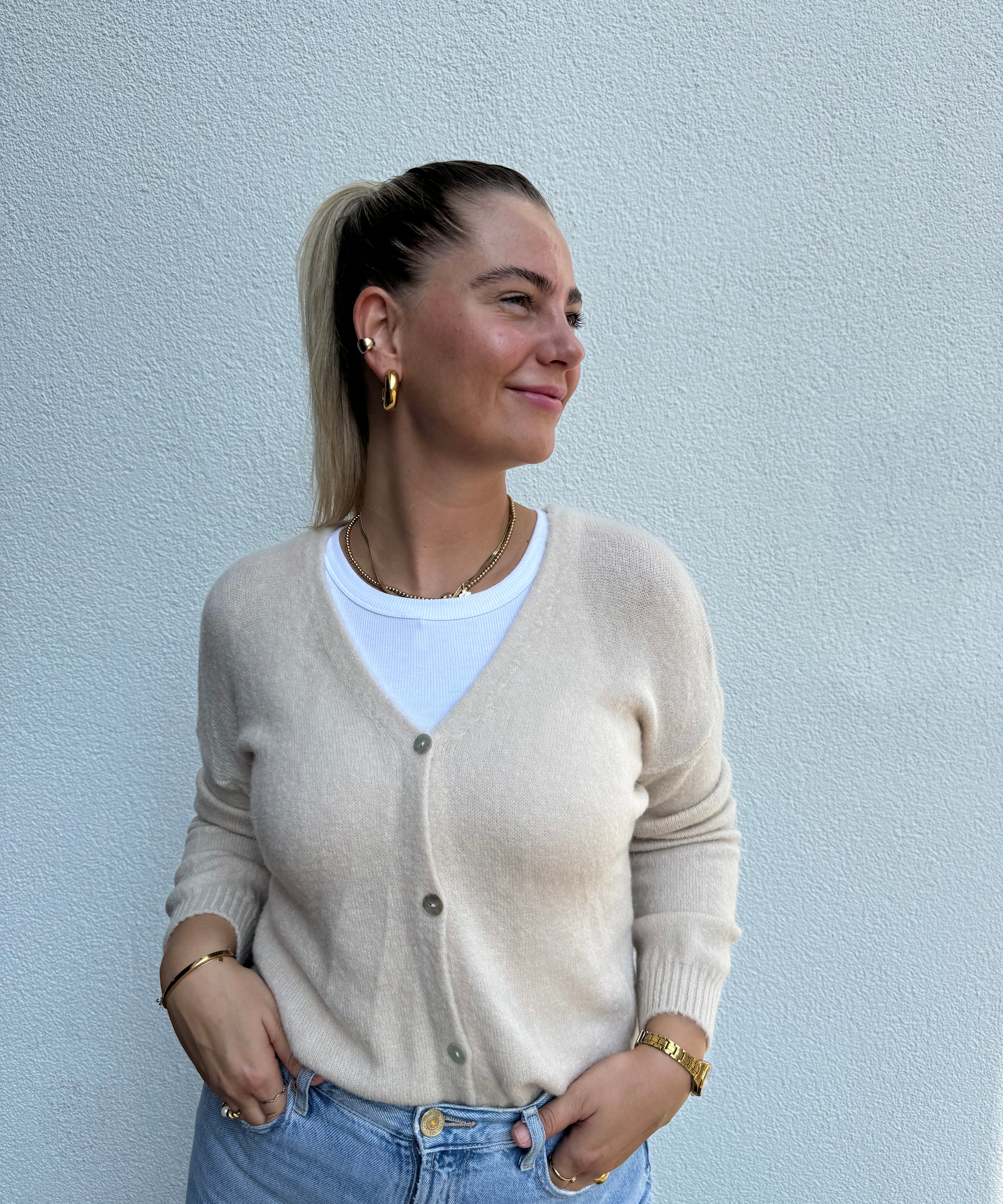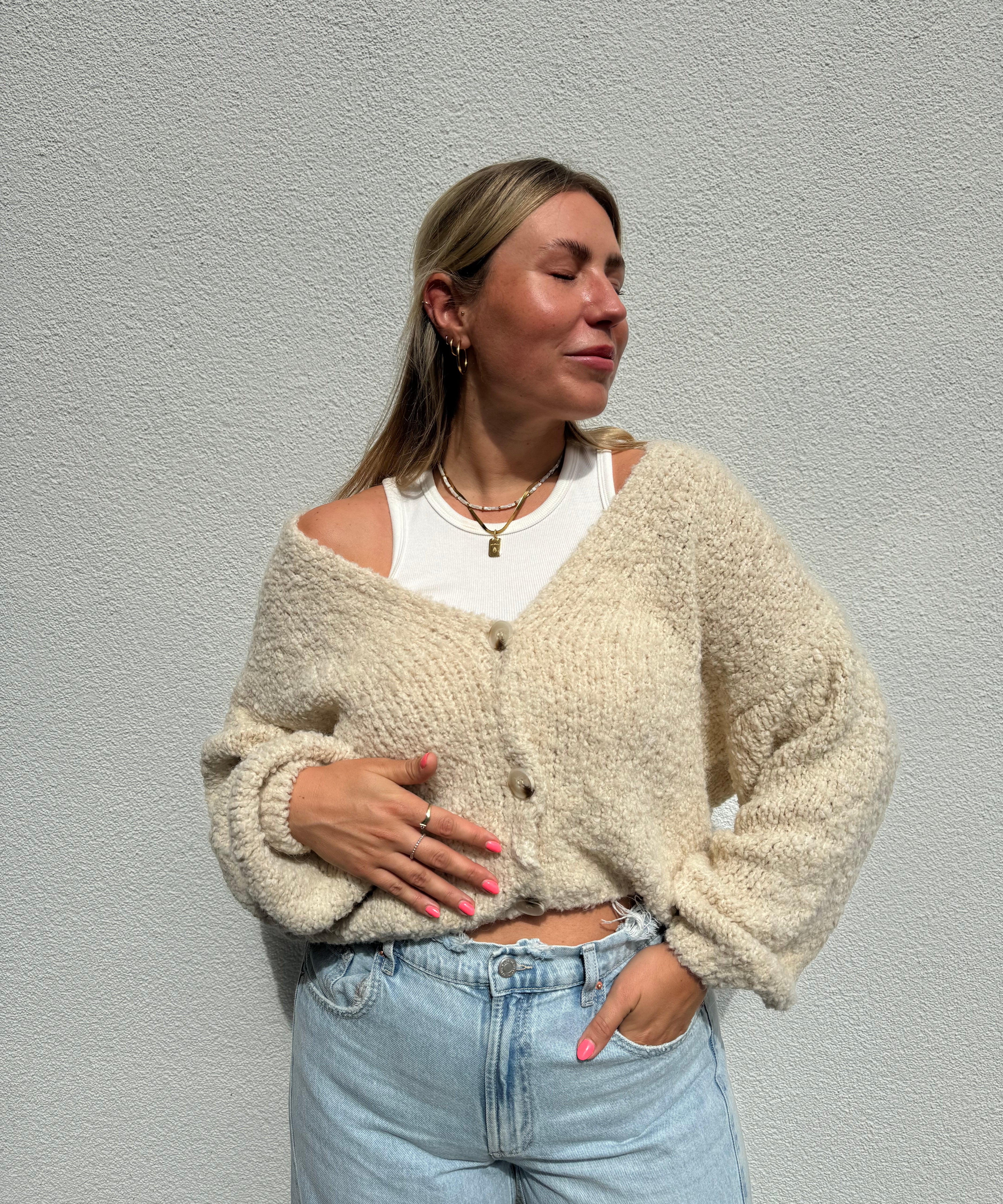 Strickweste mit goldenen Knöpfen Beige von vorne