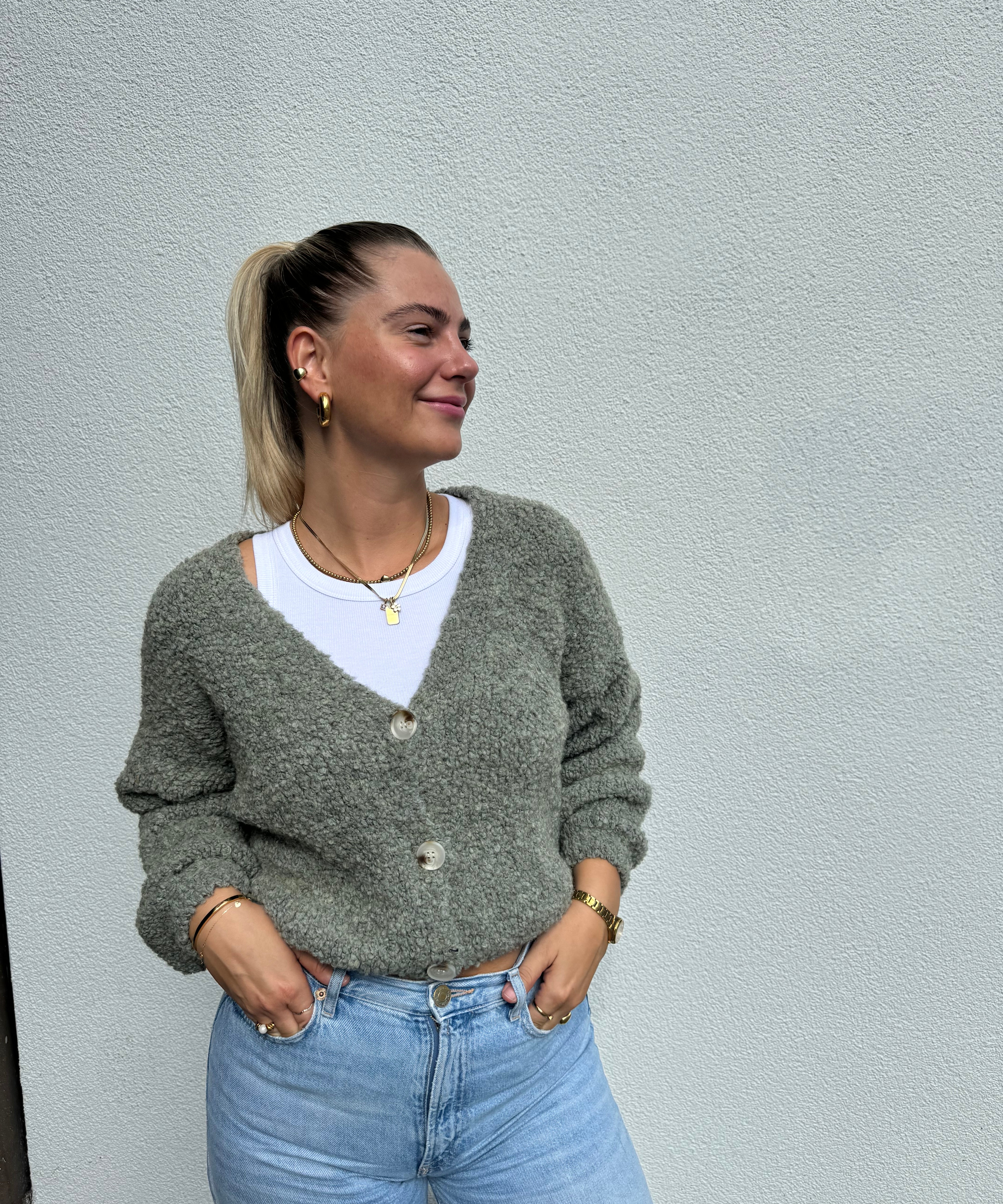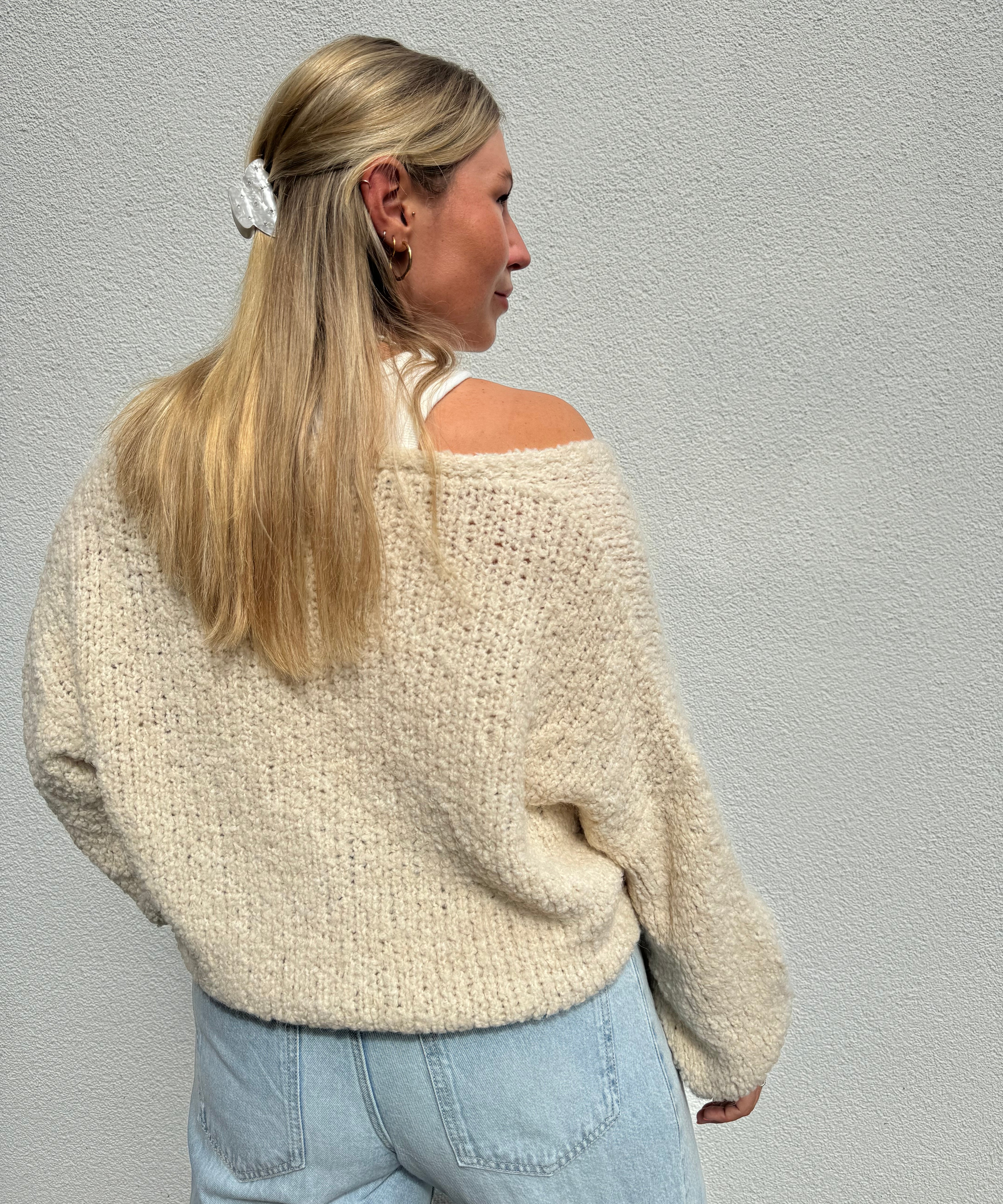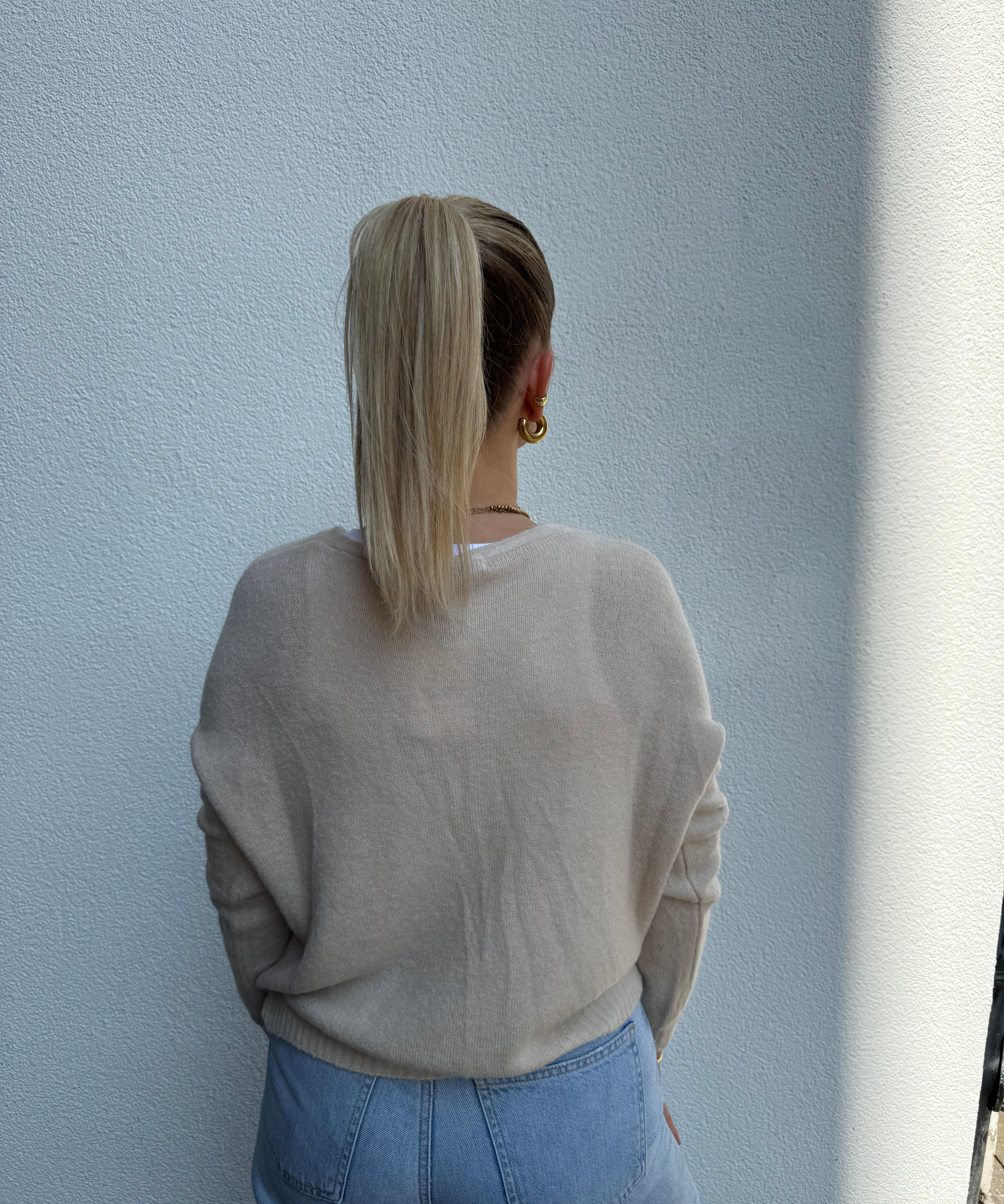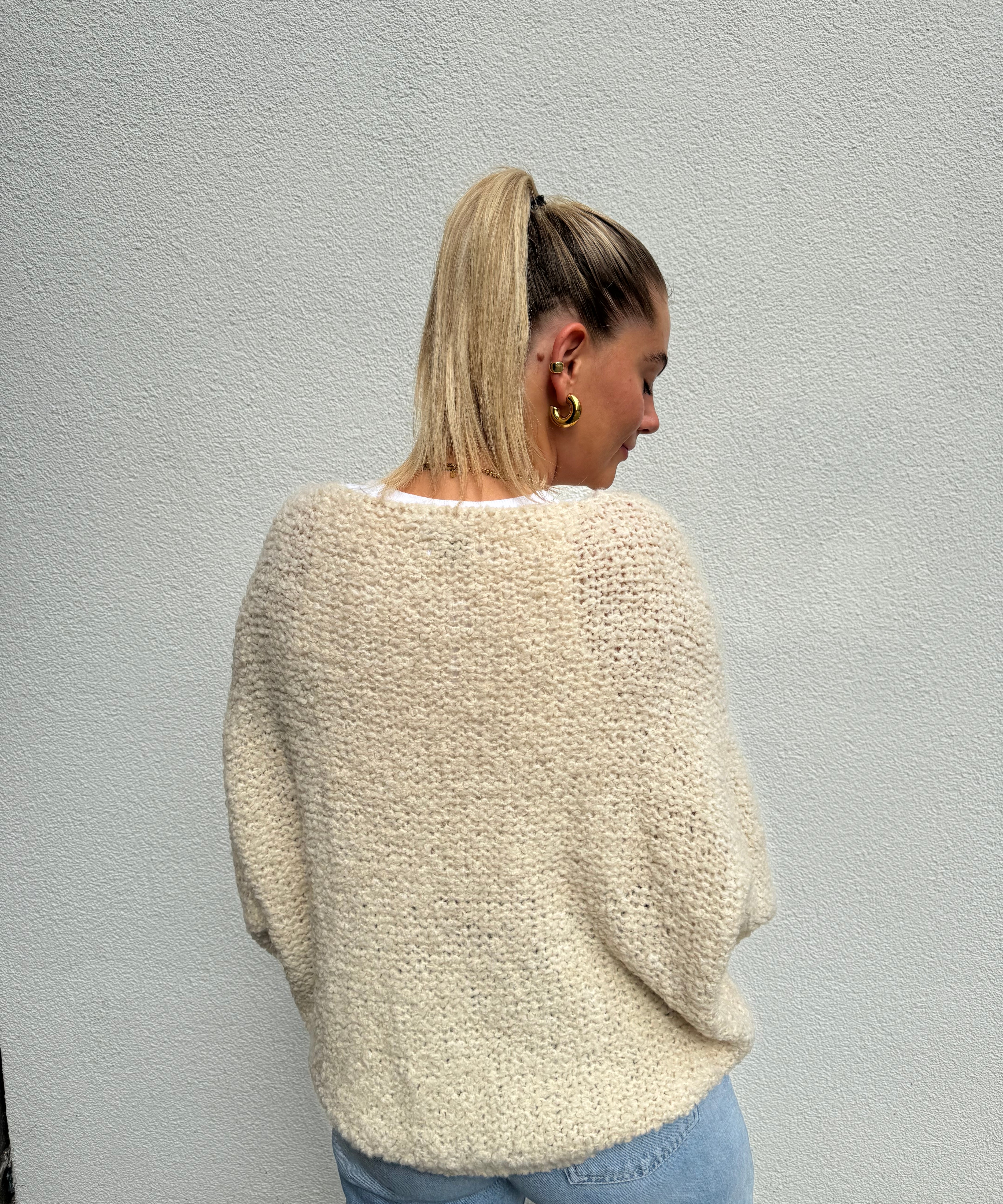 Strickweste mit goldenen Knöpfen Beige von hinten