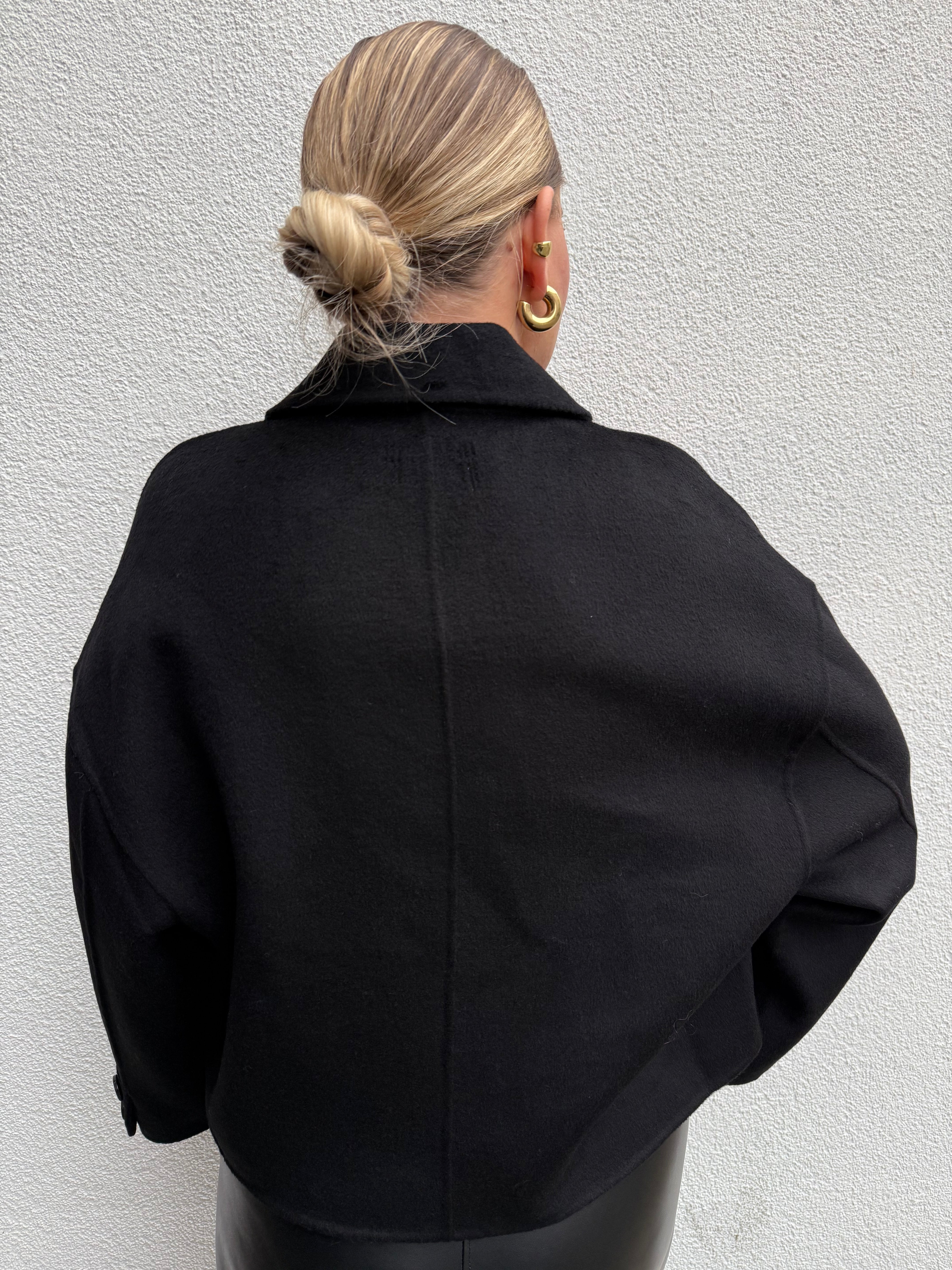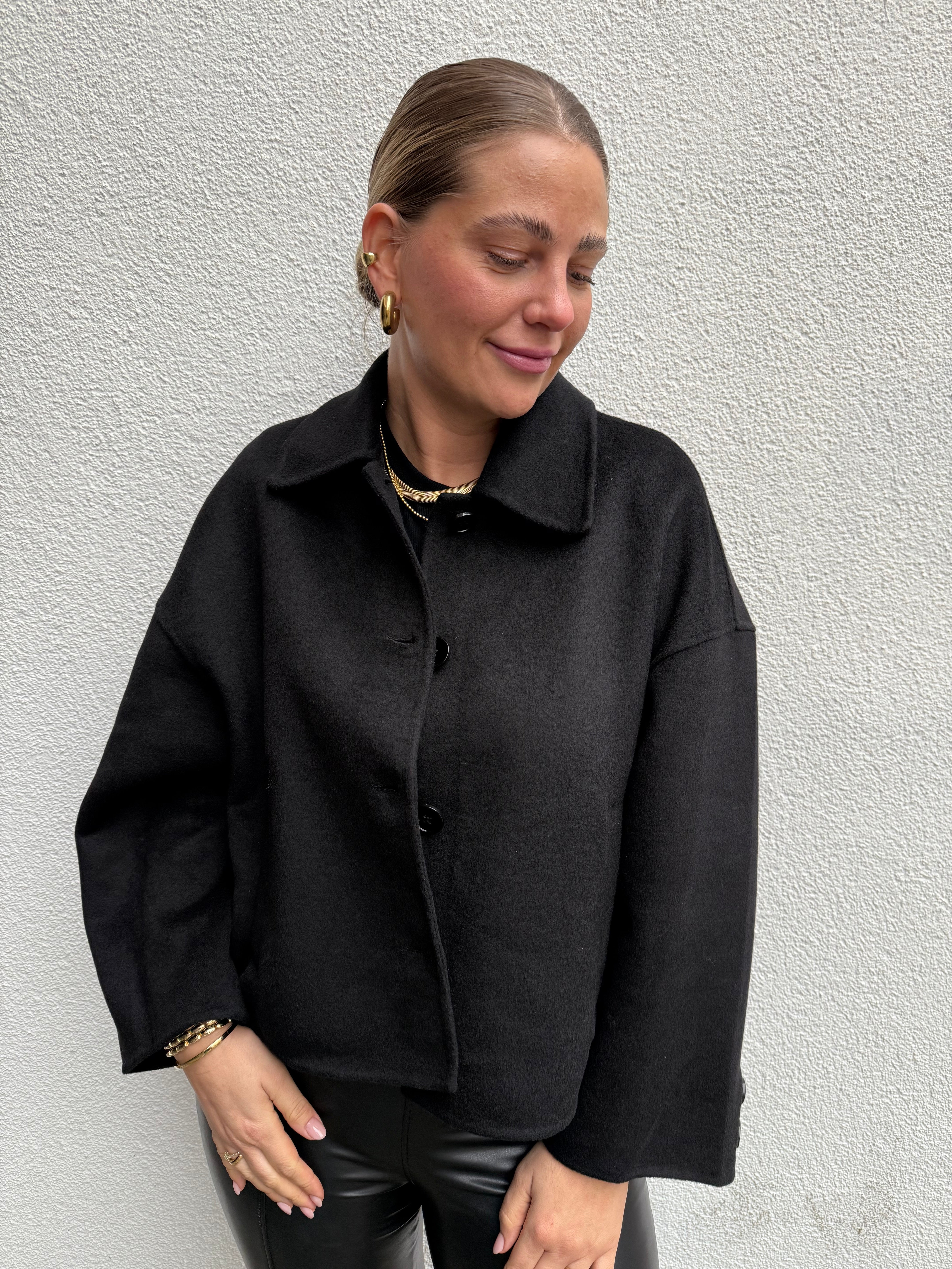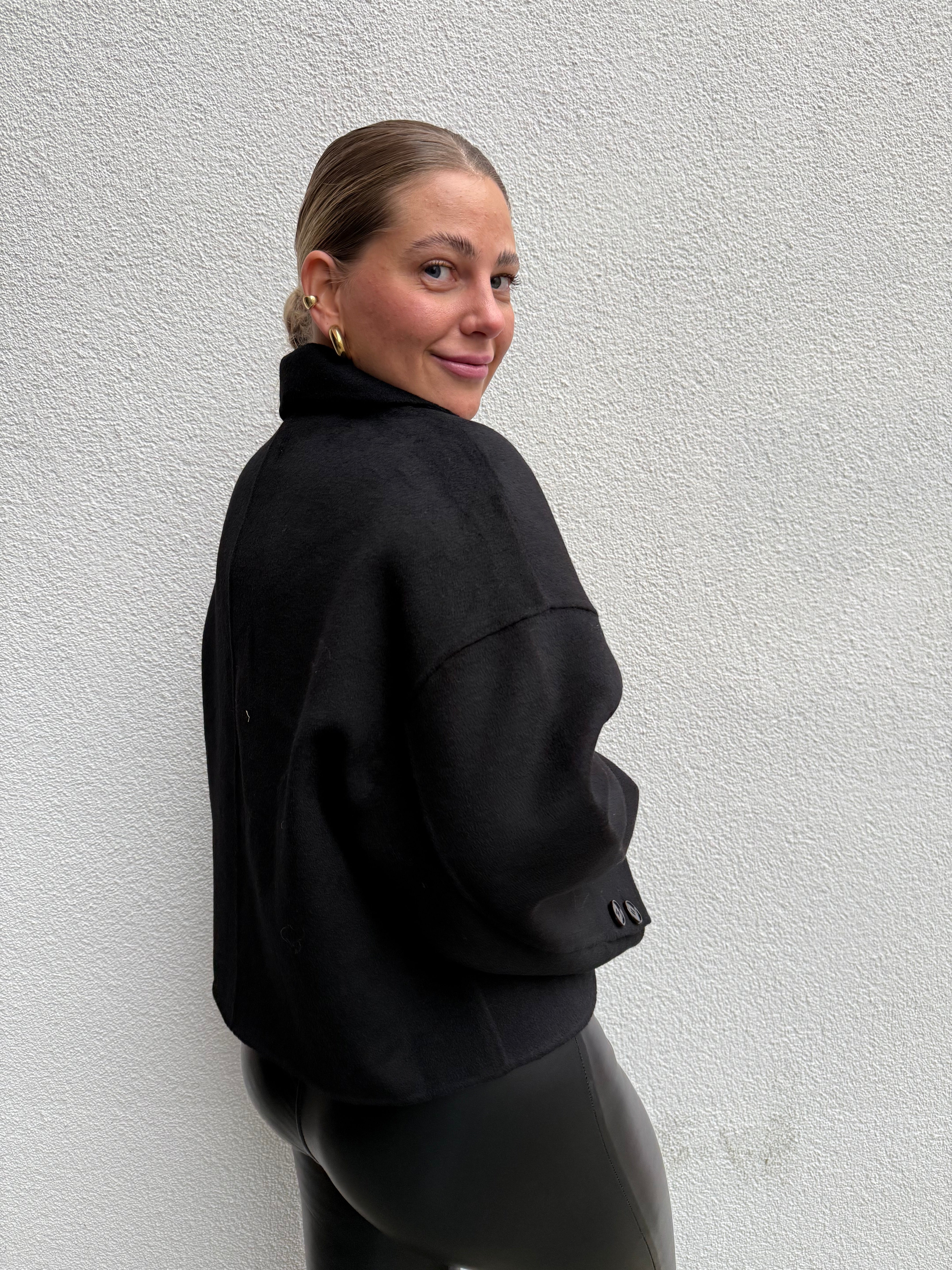 Jacke Caban Mittellang Kragen Knopfleiste Schwarz