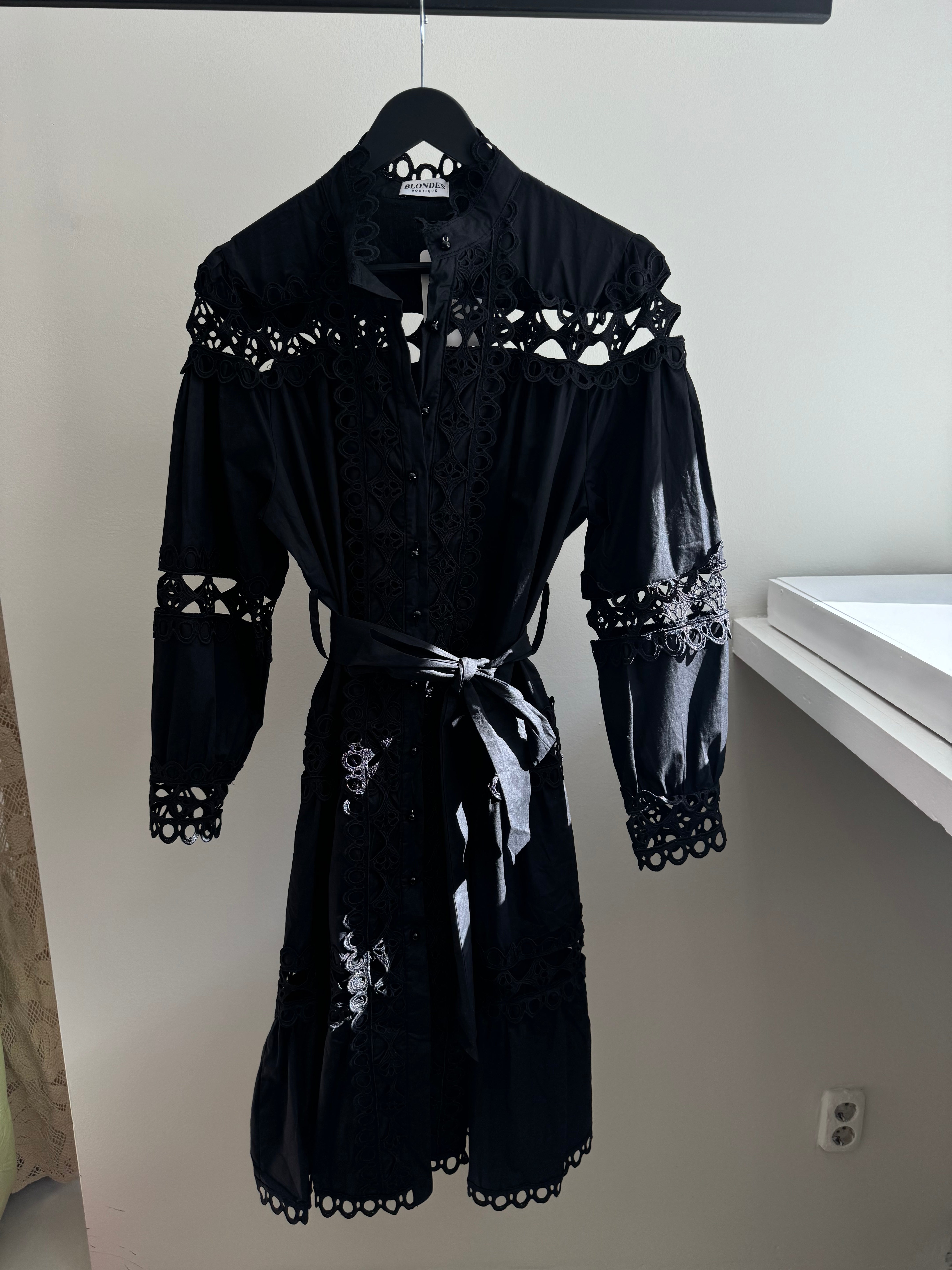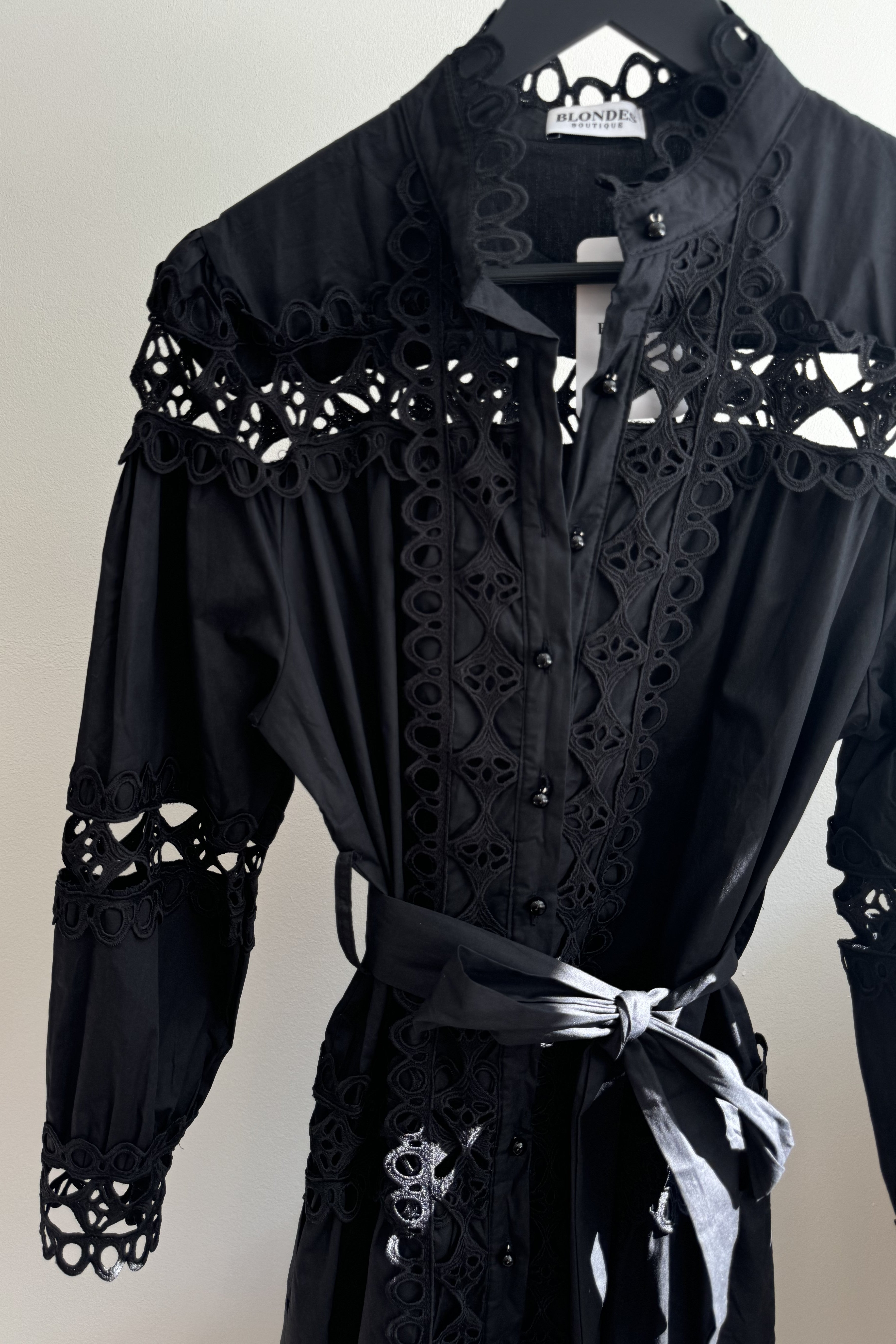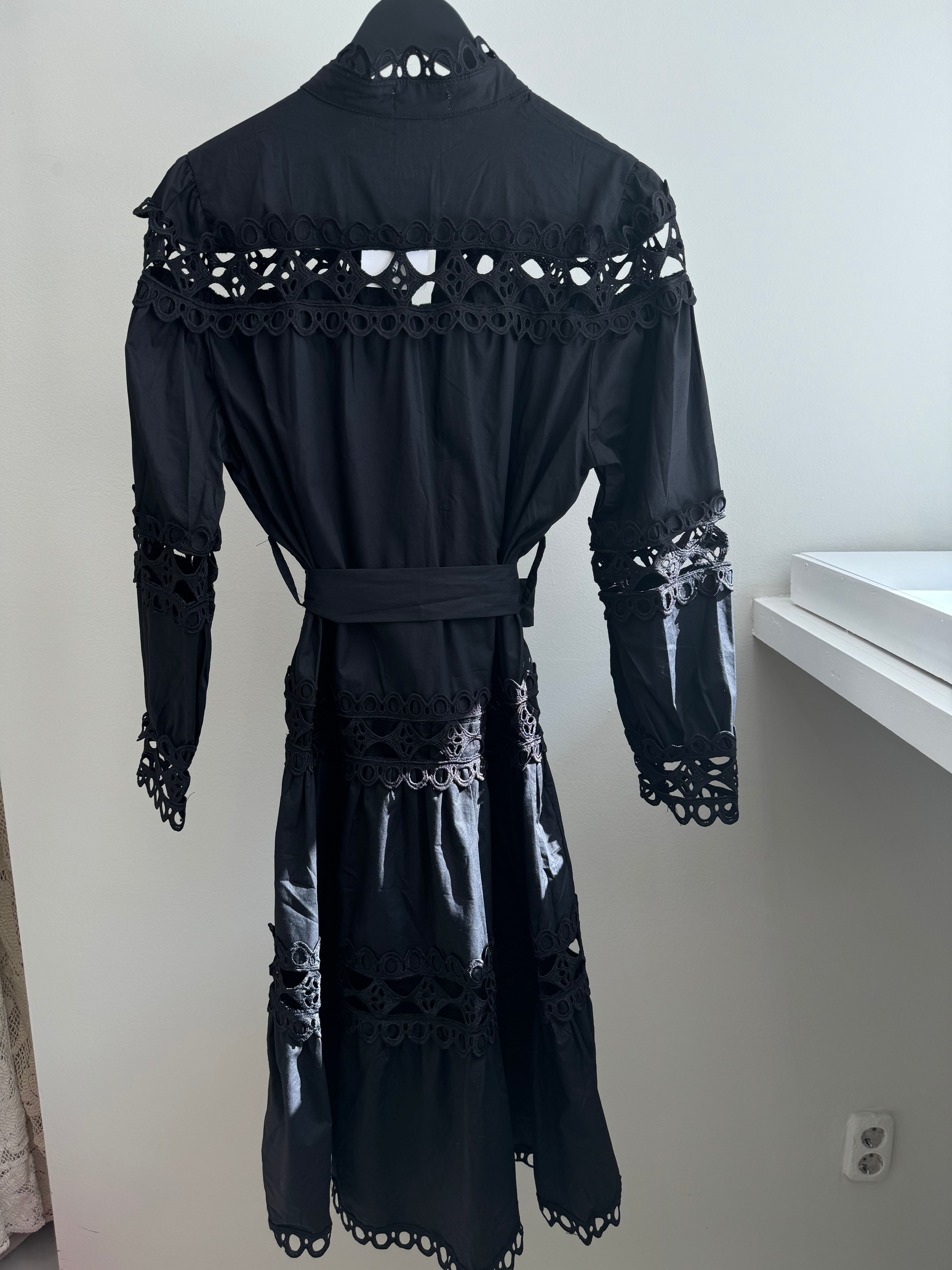 Kleid Midi Rüschen Lochmuster mit Kragen Schwarz